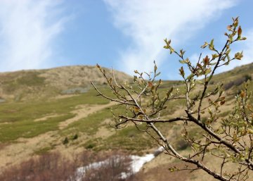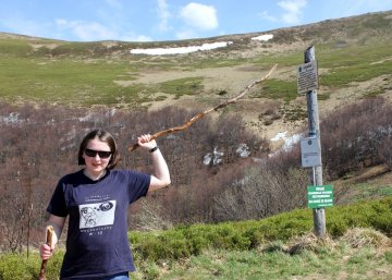 The trail thru forest takes slightly above one hour and then we reach the połoniny level, which is the name of the mountain meadow above the forest level in Bieszczady Mountains. There was still some snow left after the winter, but the temperature was pretty warm as the sky was clear and sun was very strong